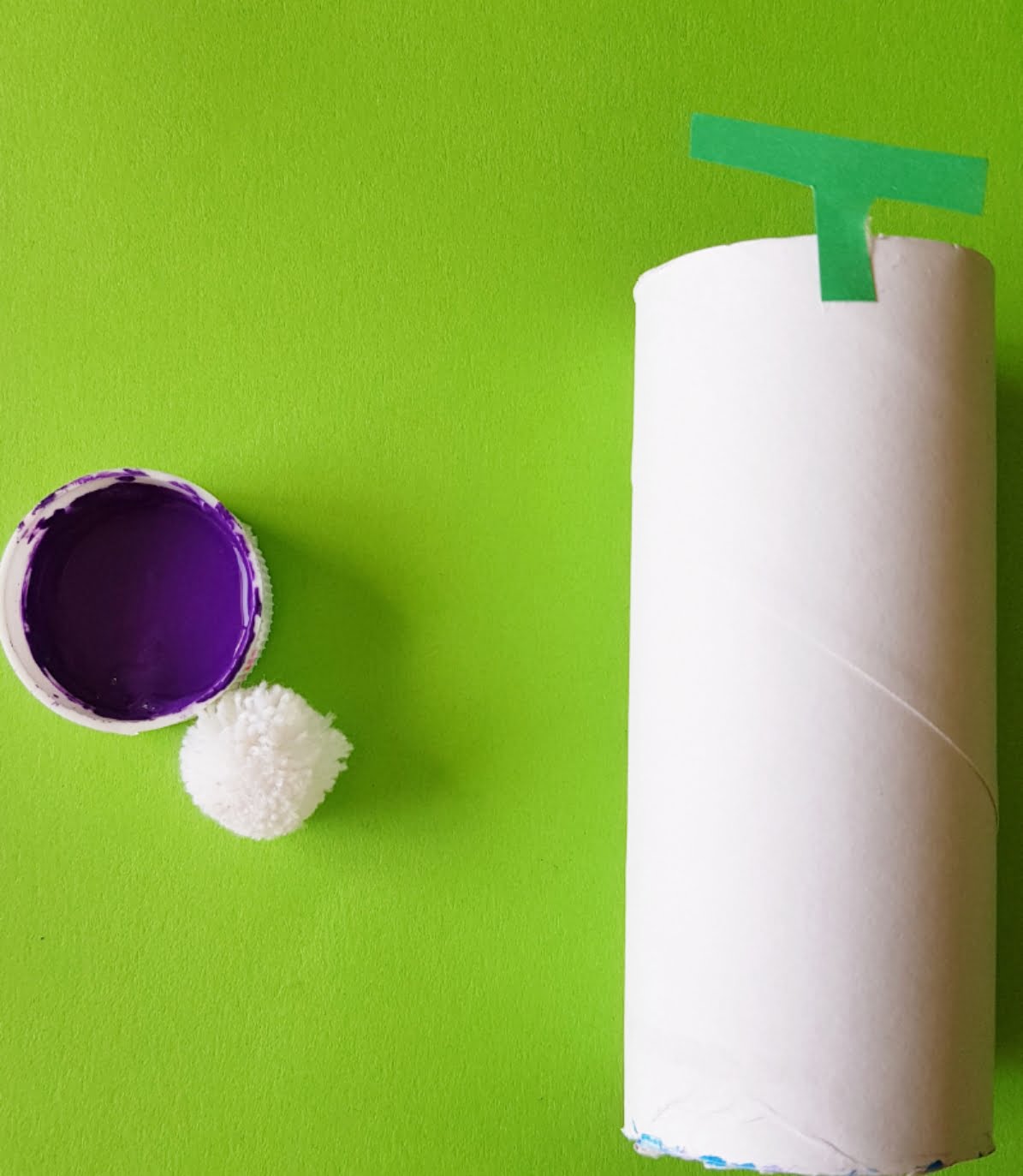 1. Take a paper roll. Take a pom pom or a cotton ball and dip it in purple paint. Now use it as a stamp to make the grapes. Tip: try it out the stamp on some plain paper first.